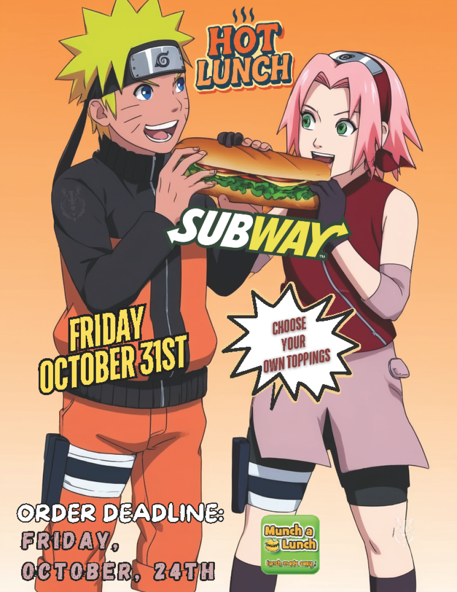 The next PAC Hot Lunch will be Subway sandwiches on Friday, October 31st. Orders must be placed and paid for by Friday, October 24th on Munch-a-Lunch. On the day, even if you ordered lunch for your child, please send them with a recess snack.
