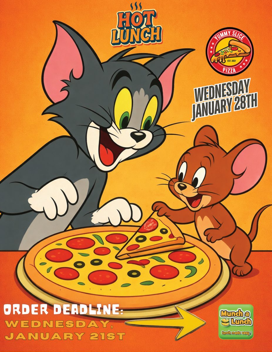On Wednesday, January 28th, PAC Hot Lunch will be pizza and pasta . Orders must be placed and paid for by Wednesday, January 21st on Munch-a-Lunch. On the day, even if you ordered lunch for your child, please send them with a recess snack.