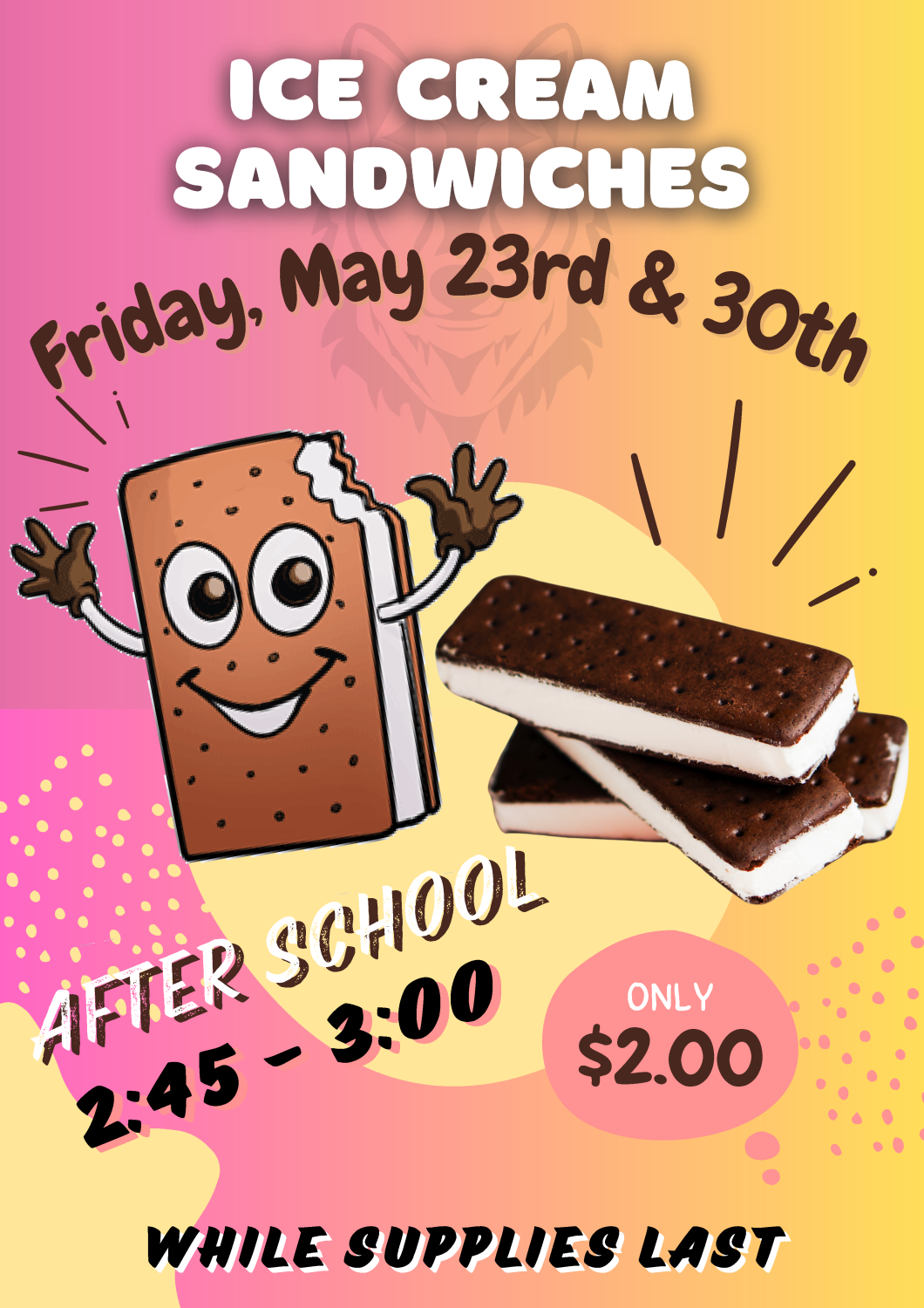 PAC will be selling ice cream sandwiches out of the Gym kitchen on Friday, May 23rd and 30th.  $2 each, only until supplies last.